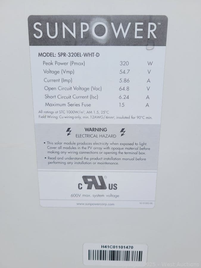 SunPower T5-SPR-320EL-WHT-D (320W) Solar Panels | West Auctions